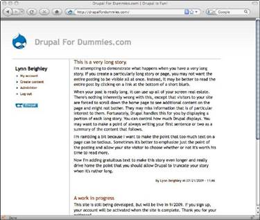 Every time you post a Article, Drupal includes information about when the content was posted and who posted it (see figure 6-7). The poster's username (in this case, Gisle Beighley) appears, along with the time and date the Article was posted.